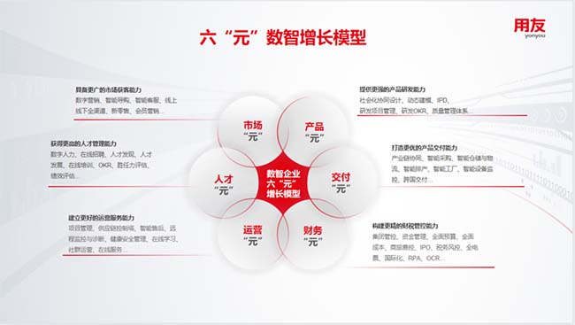 基于對(duì)典型客戶的分析,結(jié)合知名管理理論和過往實(shí)踐,用友將成長型企業(yè)經(jīng)營管理的基本要素進(jìn)一步抽象,以“元”為初始,重磅推出了全新的企業(yè)價(jià)值模型,即六“元”數(shù)智增長模型。