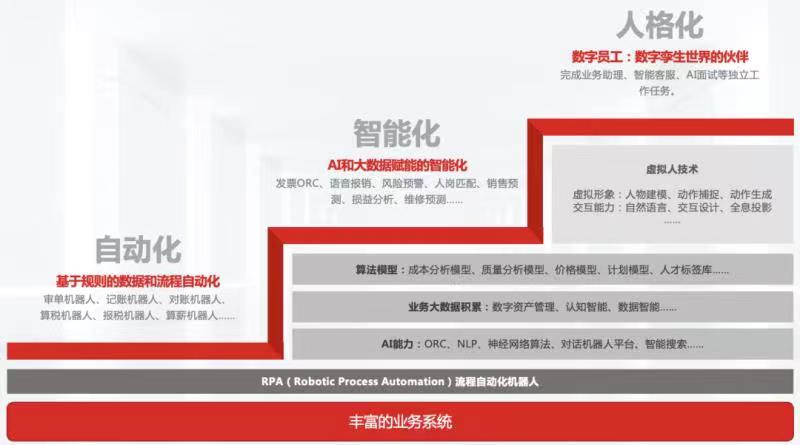 不同于閱讀、聊天、搜索等面向終端用戶的應(yīng)用場景,人工智能在企業(yè)級領(lǐng)域的應(yīng)用更具復(fù)雜性。在這一過程中,從早期依托RPA技術(shù)實(shí)現(xiàn)基于規(guī)則的數(shù)據(jù)和流程自動化,到借助OCR、NLP、算法模型等實(shí)現(xiàn)AI和大數(shù)據(jù)賦能的智能化,再到基于虛擬人技術(shù)的數(shù)智員工的誕生,AI技術(shù)在企業(yè)領(lǐng)域的應(yīng)用歷經(jīng)自動化、智能化、人格化的發(fā)展過程。