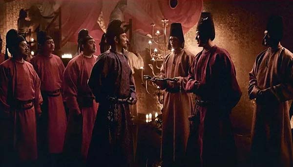 李善德要跑通各個衙門要錢要人要馬匹時,就像一個大廠員工為了完成項(xiàng)目,跑財(cái)務(wù)、人力、技術(shù)、市場等部門,各個部門把鍋甩得滿天飛,他只能仰頭長嘆,不知道從何理起這團(tuán)亂麻。電影里也將大唐朝堂幾乎拍成了一個大廠員工跑寫字樓的構(gòu)圖和視覺效果,上上下下,見了各種嘴臉,李善德站在一個圓圈的中間愁眉苦臉。閉環(huán)的意思,原來是讓人無路可走。