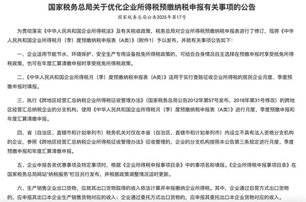 近期,國家稅務總局發(fā)布的《關于優(yōu)化企業(yè)所得稅預繳納稅申報有關事項的公告》(國家稅務總局公告 2025 年第 17 號),則為小微企業(yè)帶來了諸多利好。