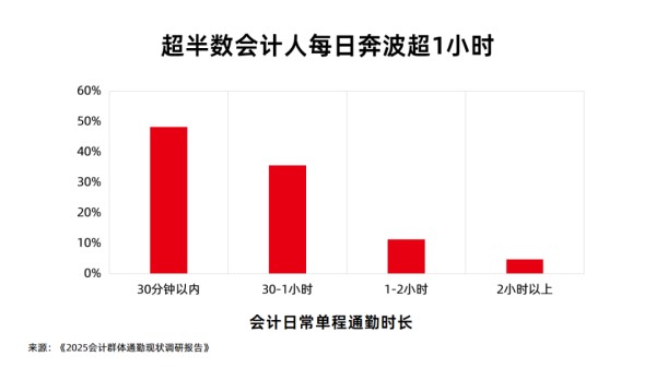 會(huì)計(jì)人對(duì)時(shí)間的掌控欲在通勤中體現(xiàn)得淋漓盡致。數(shù)據(jù)顯示,42.3%的會(huì)計(jì)人單程通勤時(shí)間在30分鐘以?xún)?nèi),占比最高。然而,仍有近5%的會(huì)計(jì)人面臨單程2小時(shí)以上的漫長(zhǎng)通勤,他們戲稱(chēng)自己“上班像取經(jīng),通勤是八十一難”。