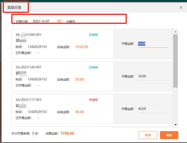 2.勾選要進(jìn)行開票的單據(jù),點(diǎn)擊表體右上角的【開票】,輸入發(fā)票號(hào)、開票日期等數(shù)據(jù),即可對(duì)多張單據(jù)進(jìn)行開票處理。