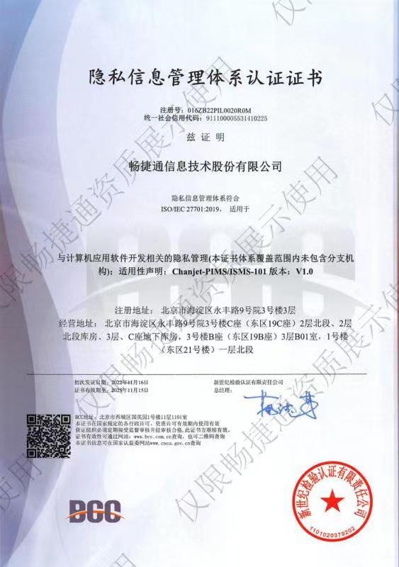 ISO27701是國(guó)際標(biāo)準(zhǔn)化組織(ISO)和國(guó)際電?工委員會(huì)(IEC)聯(lián)合發(fā)布的隱私信息管理體系國(guó)際標(biāo)準(zhǔn),它是對(duì)ISO27001信息安全管理體系的擴(kuò)展。ISO27701不僅是一個(gè)管理體系,還是一個(gè)通用的信息安全控制措施集合,在14個(gè)控制域里提出了35個(gè)安全控制目標(biāo)和114個(gè)控制措施,全面保障公司的信息安全。用友暢捷通已于2021年就通過(guò)了ISO27001資質(zhì)認(rèn)證。