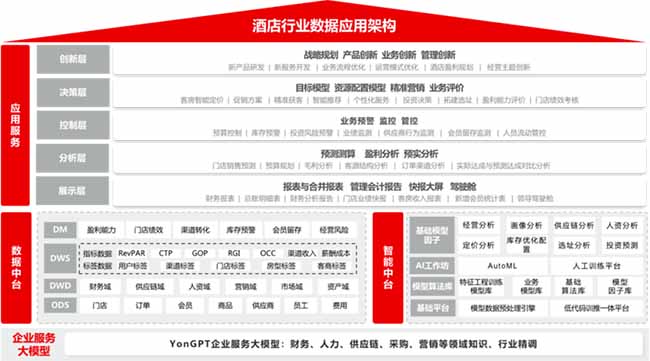 以YonGPT企業(yè)大模型為支撐,通過用友iuap數(shù)據(jù)中臺(tái)對(duì)酒店企業(yè)的人、財(cái)、經(jīng)營(yíng)、營(yíng)銷、資產(chǎn)、供應(yīng)鏈等多元業(yè)務(wù)數(shù)據(jù)進(jìn)行匯聚和治理,并圍繞核心業(yè)務(wù)線的經(jīng)營(yíng)、管理、會(huì)員、運(yùn)營(yíng)等重要指標(biāo)構(gòu)建分析體系,利用智能中臺(tái)的模型算法庫訓(xùn)練、構(gòu)建的酒店行業(yè)模型因子,為酒店企業(yè)提供5層全面數(shù)據(jù)服務(wù),深入洞察企業(yè)運(yùn)營(yíng)、識(shí)別潛在的業(yè)務(wù)風(fēng)險(xiǎn)和機(jī)會(huì),并提供智能化的解決方案,從而提高經(jīng)營(yíng)決策水平和業(yè)務(wù)運(yùn)營(yíng)效率。