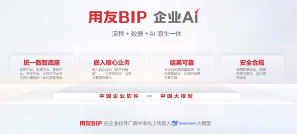 年初,用友BIP企業(yè)AI的發(fā)布,為企業(yè)應(yīng)用AI提供了落地抓手。面對(duì)眾多企業(yè)在系統(tǒng)分散、數(shù)據(jù)孤島中的困境,用友結(jié)合企業(yè)AI的四大特性——統(tǒng)一數(shù)智底座、嵌入核心業(yè)務(wù)、結(jié)果可靠、安全合規(guī),提出了一個(gè)關(guān)鍵性命題:真正有效果的、可持續(xù)輸出價(jià)值的AI,必須扎根于“原生一體化”的土壤之中。