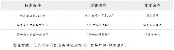 IF 投標截止時間 < NOW() AND 投標數(shù) < 3 THEN 發(fā)送預警