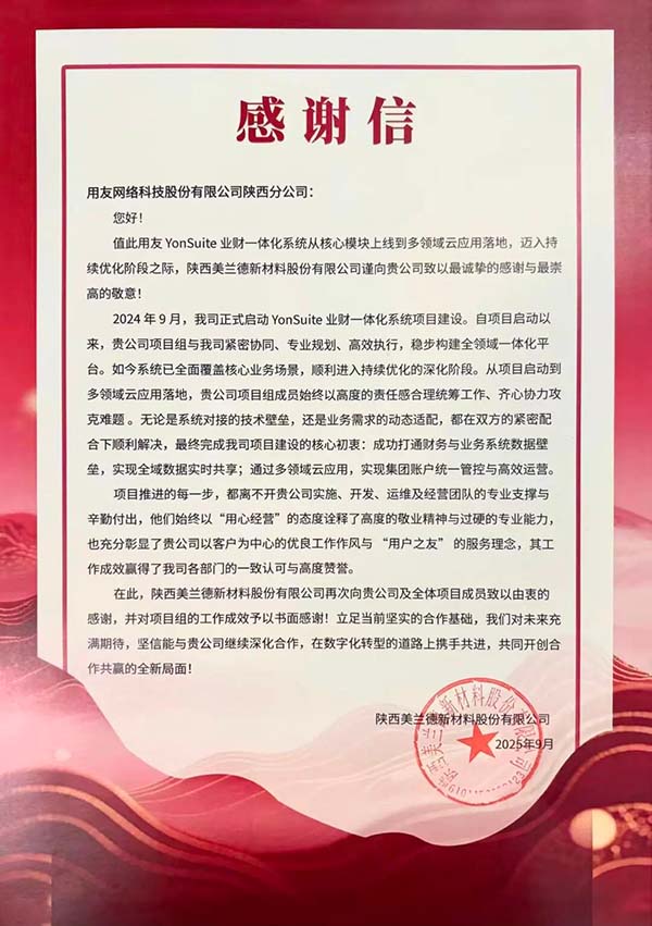 在陜西這片千年秦韻與現(xiàn)代科創(chuàng)交相輝映的熱土上,制造業(yè)的數(shù)智化轉型浪潮奔涌向前。陜西美蘭德新材料股份有限公司,作為國內炭/炭復合材料領域的領軍企業(yè),在與用友網絡科技股份有限公司陜西分公司的長期合作中,始終以深度信任為基礎,堅持“整體規(guī)劃、分步實施”策略,穩(wěn)步推進數(shù)智化轉型。雙方以用友YonSuite全鏈路云服務為支撐,攜手打造一體化數(shù)智平臺,實現(xiàn)了業(yè)財深度融合與高效協(xié)同管理,為陜西制造業(yè)的轉型升級提供了可借鑒的實踐路徑。