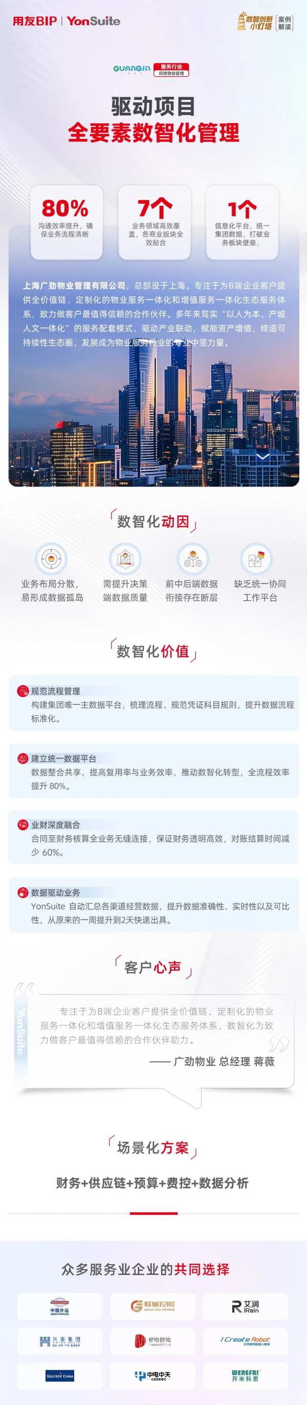 上海廣勁物業(yè)管理有限公司財(cái)務(wù)總蔣薇說:“我們一直專注給 B 端企業(yè)客戶,打造全流程、定制化的物業(yè)服務(wù)和增值服務(wù)生態(tài)。這次和用友 YonSuite 合作搞數(shù)智化,就是想成為客戶最靠譜的伙伴。” 從蔣薇這番話能看出來,廣勁物業(yè)下定決心,要用數(shù)智化升級(jí)物業(yè)服務(wù)。事實(shí)證明,這次轉(zhuǎn)型特別成功,不僅解決了數(shù)據(jù)不通、流程卡殼的老問題,還搭建起一套完整的項(xiàng)目數(shù)智化管理體系,給以后提升服務(wù)、拓展業(yè)務(wù)打下了堅(jiān)實(shí)基礎(chǔ)。