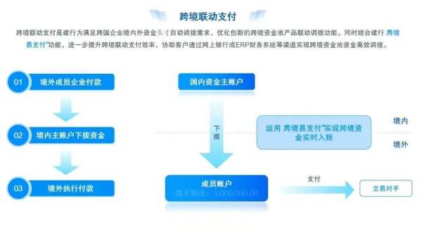 針對(duì)跨國(guó)企業(yè) “境內(nèi)外資金頭寸自動(dòng)調(diào)配” 的核心需求,建設(shè)銀行在跨境資金池基礎(chǔ)上,優(yōu)化創(chuàng)新跨境聯(lián)動(dòng)支付功能;同時(shí)整合 “建設(shè)銀行跨境易支付” 服務(wù),進(jìn)一步提升支付效率 —— 企業(yè)可通過網(wǎng)上銀行或 ERP 財(cái)務(wù)系統(tǒng),直接發(fā)起跨境資金池內(nèi)的資金調(diào)撥,無(wú)需線下提交材料,操作便捷且實(shí)時(shí)到賬。
