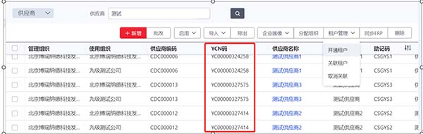 已經(jīng)開通和關(guān)聯(lián)租戶的供應商在供應商檔案列表有YCN碼就是供應商在平臺的唯一身份證號碼。只要有這個號碼,就可以進行采購合同的協(xié)同。下面就詳細講采購合同協(xié)同的操作過程。